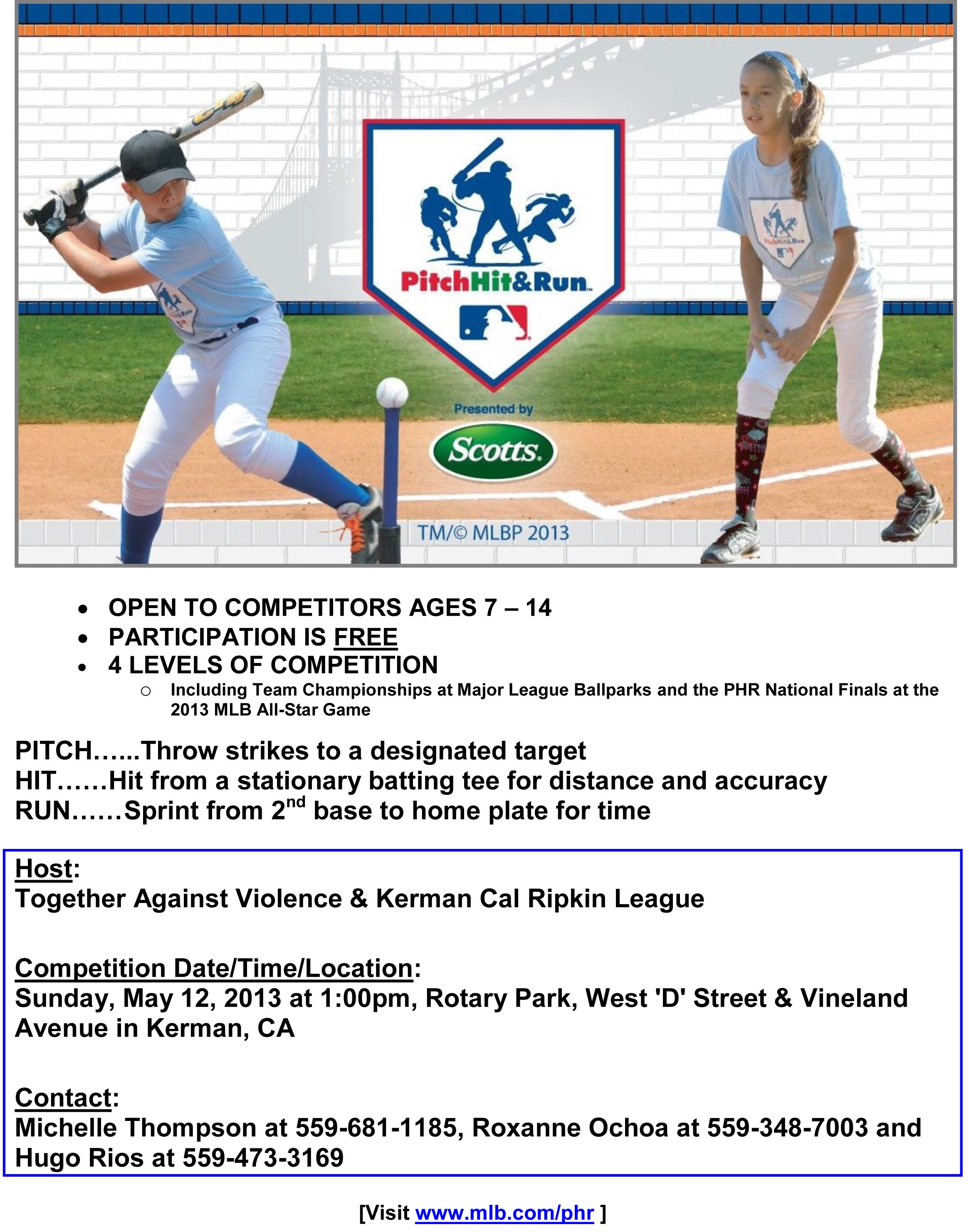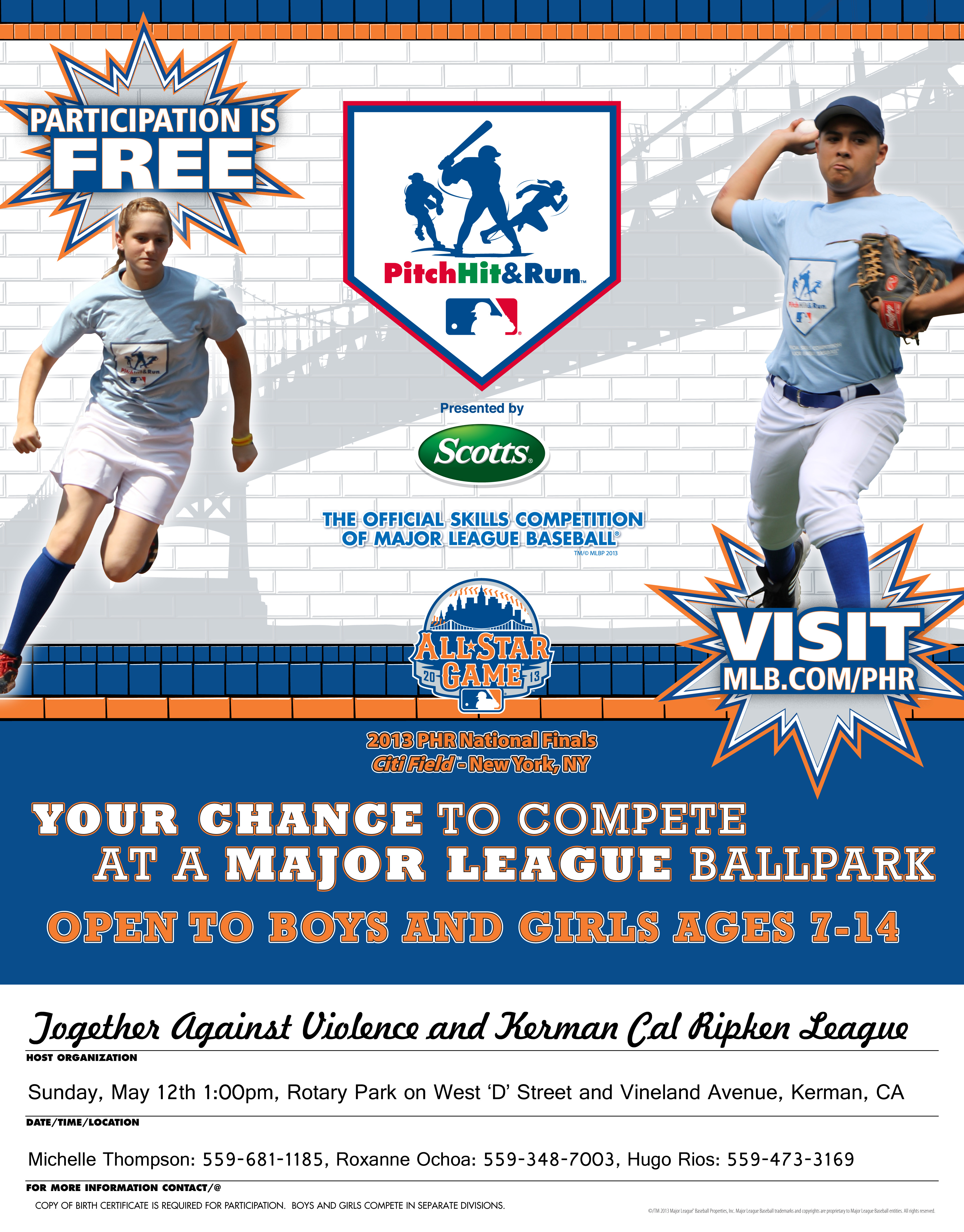Together Against Violence and Kerman Cal Ripkin League will host a free Major League Baseball® Pitch, Hit & Run™ Competition for area youth.